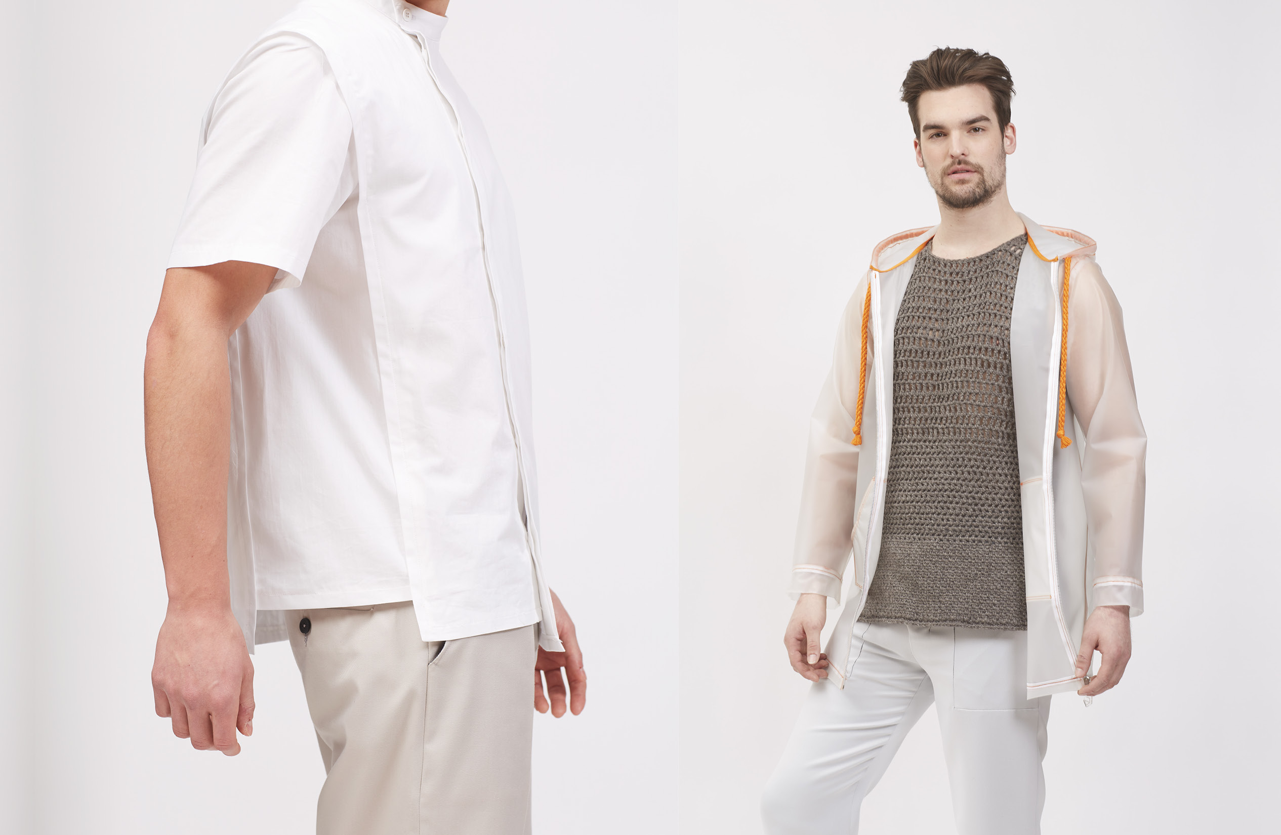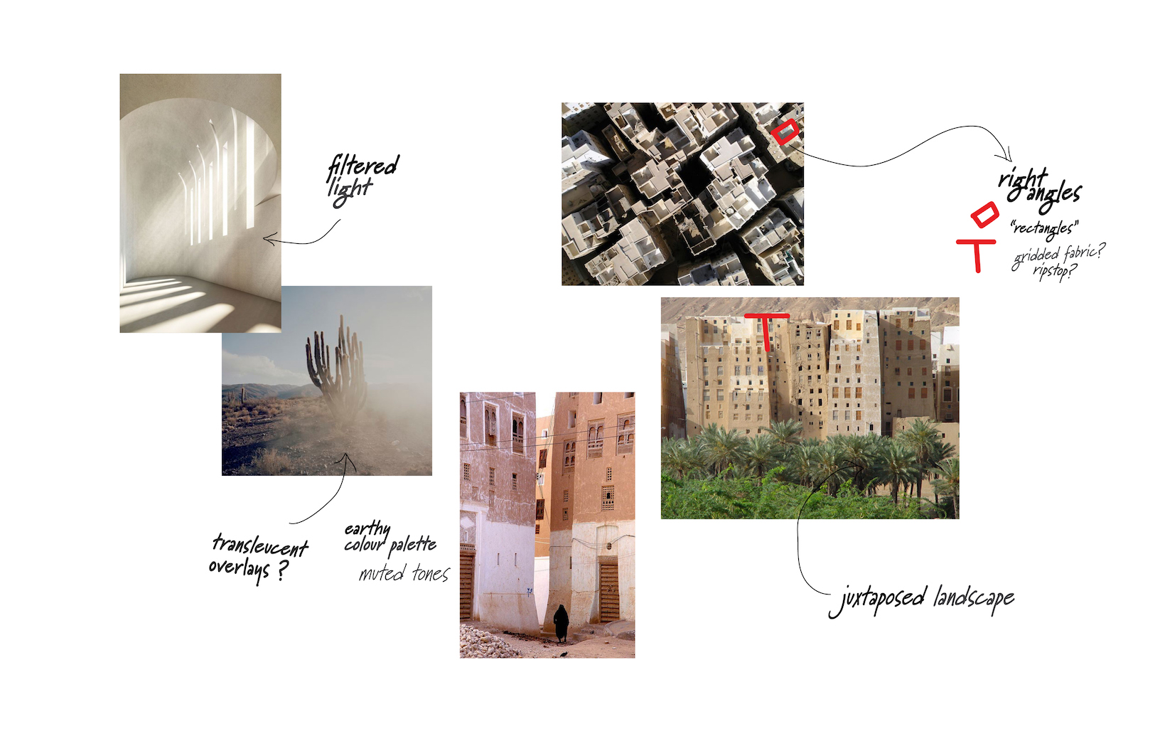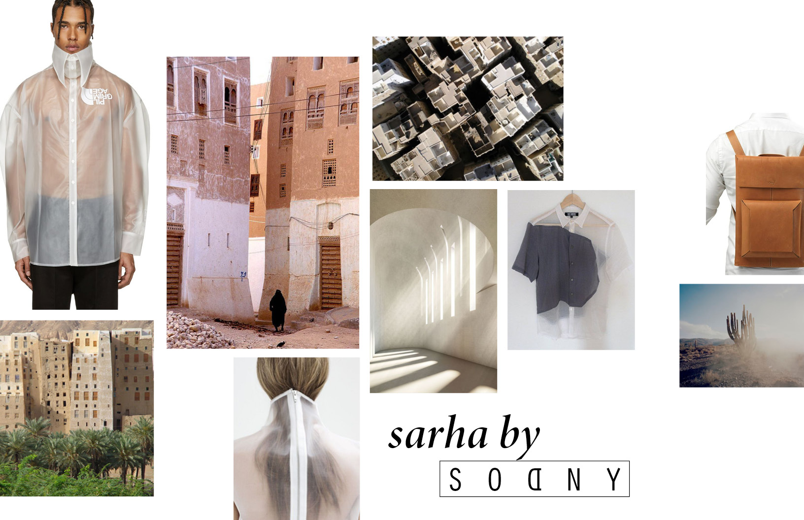 Inspired by Shibam’s 16th century mud-brick architecture and the fog that rolls into the city, SODNY’s sarha men’s collection blends the concept of diffused light and angular shapes. The complexion of the mud buildings and the gritty desert sand lay stark to the foliage surrounding the city, lending inspiration for both the collection’s colour palette and key design details.