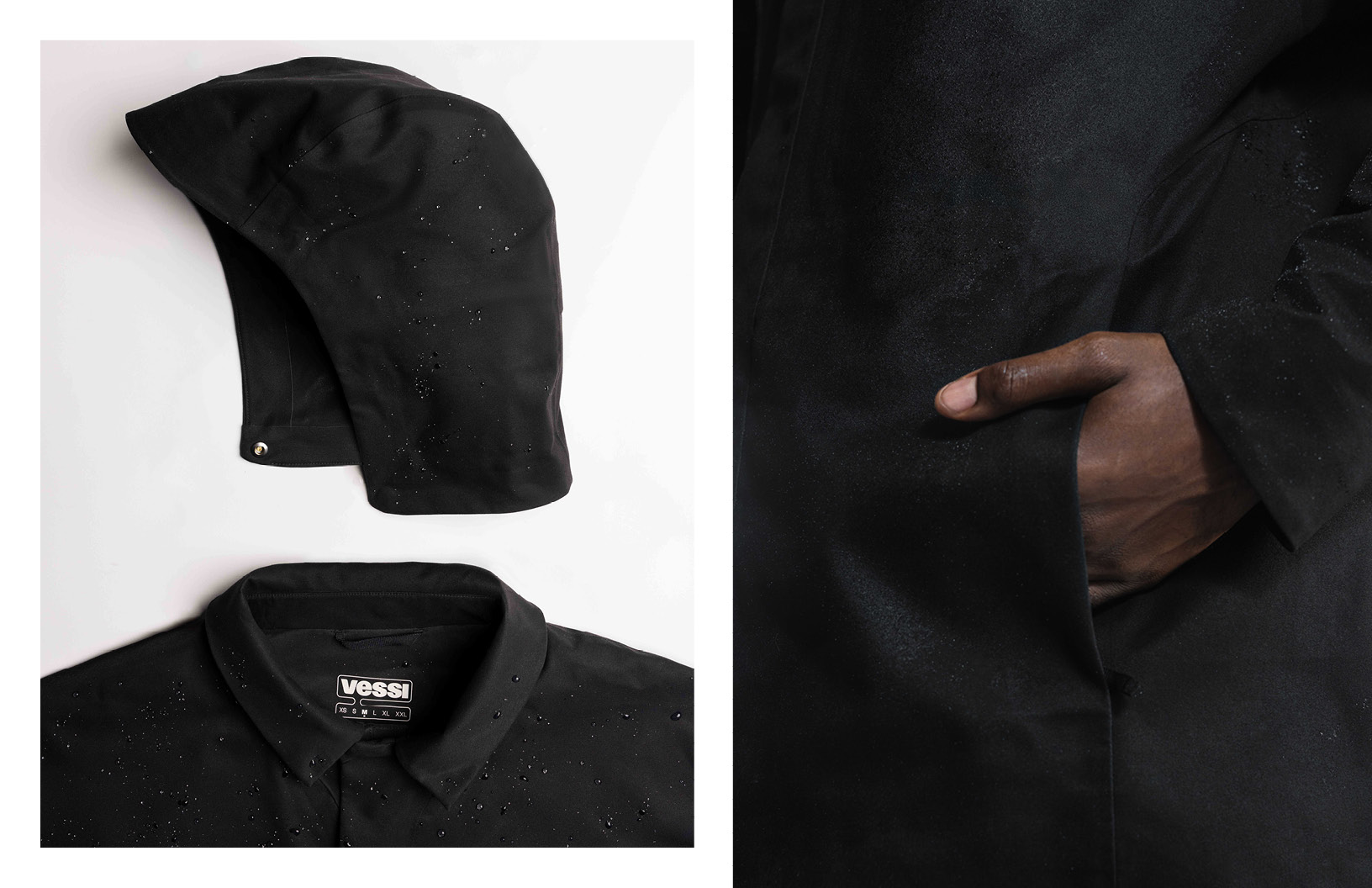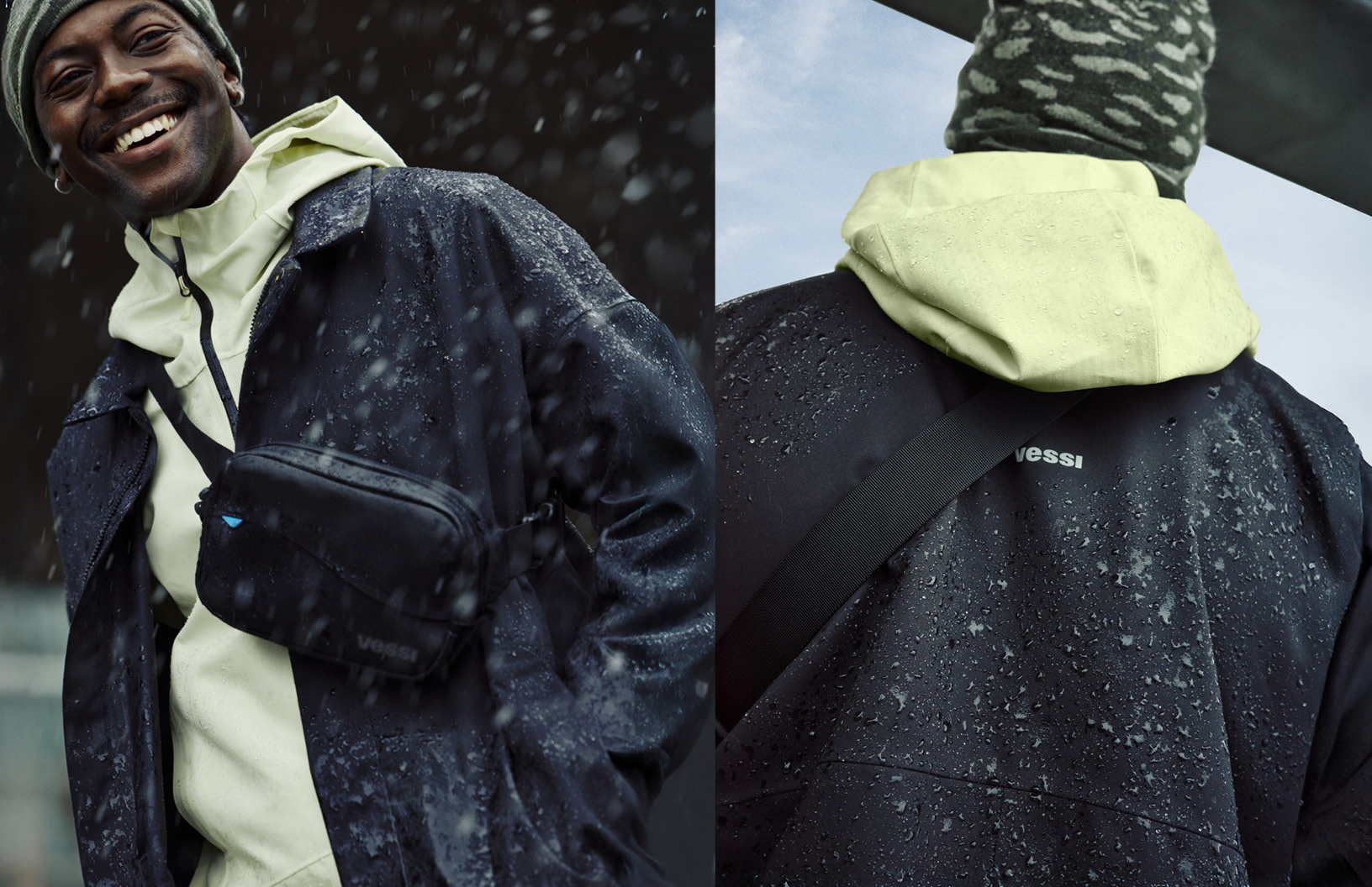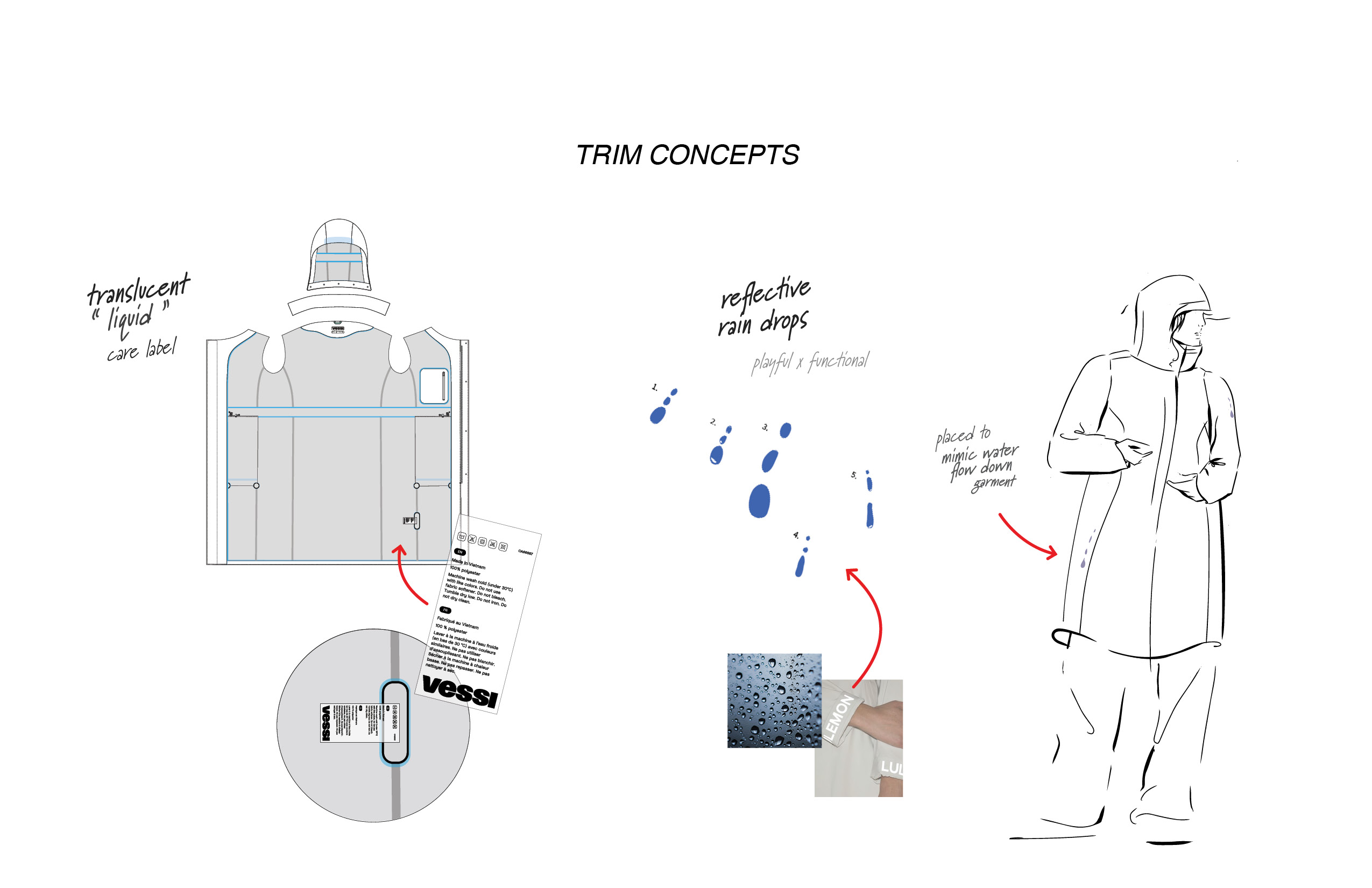 As the introduction of Vessi’s first outerwear pieces, I designed the men’s and women’s Trinity Jackets to transition seamlessly between work and play. With waterproofness as a key element of Vessi’s DNA, the jacket's foundation required excellent coverage and rain protection. To meet the challenge of delivering both an elevated solution that can be worn to work as well as have everyday versatility, I drew from tailored silhouettes and refined elements for a sophisticated aesthetic, complemented by water-inspired elements that indroduce a sense of playfulness. Further functionality was achieved through modular details, allowing stylization and versatility.