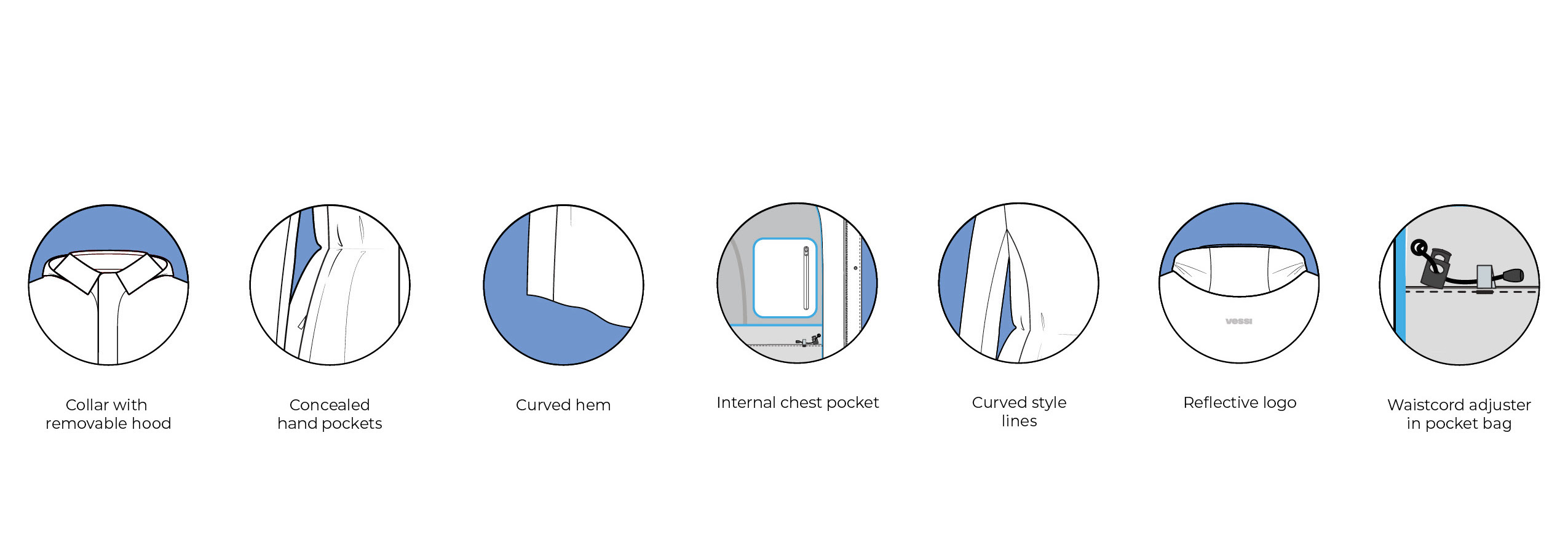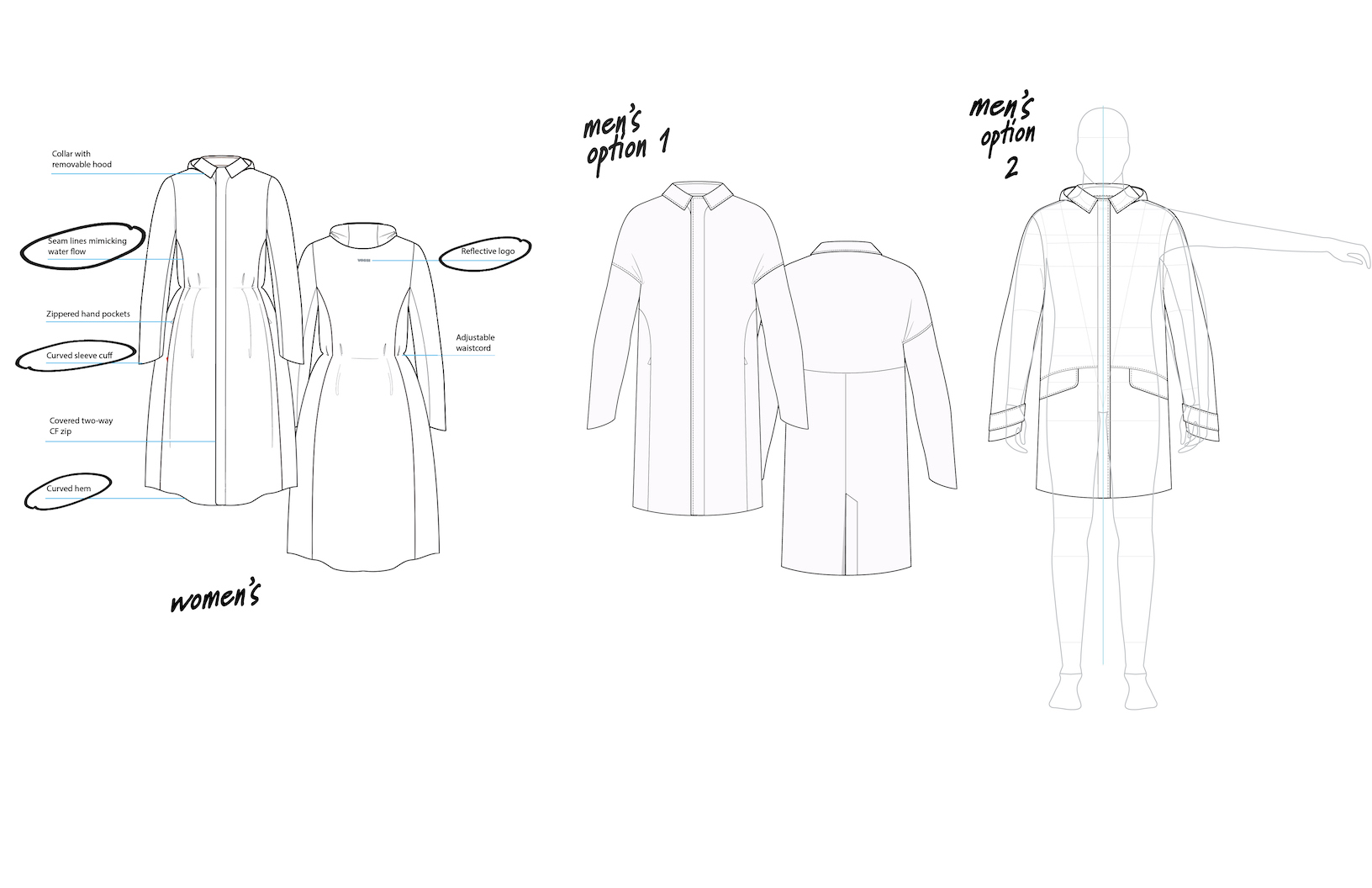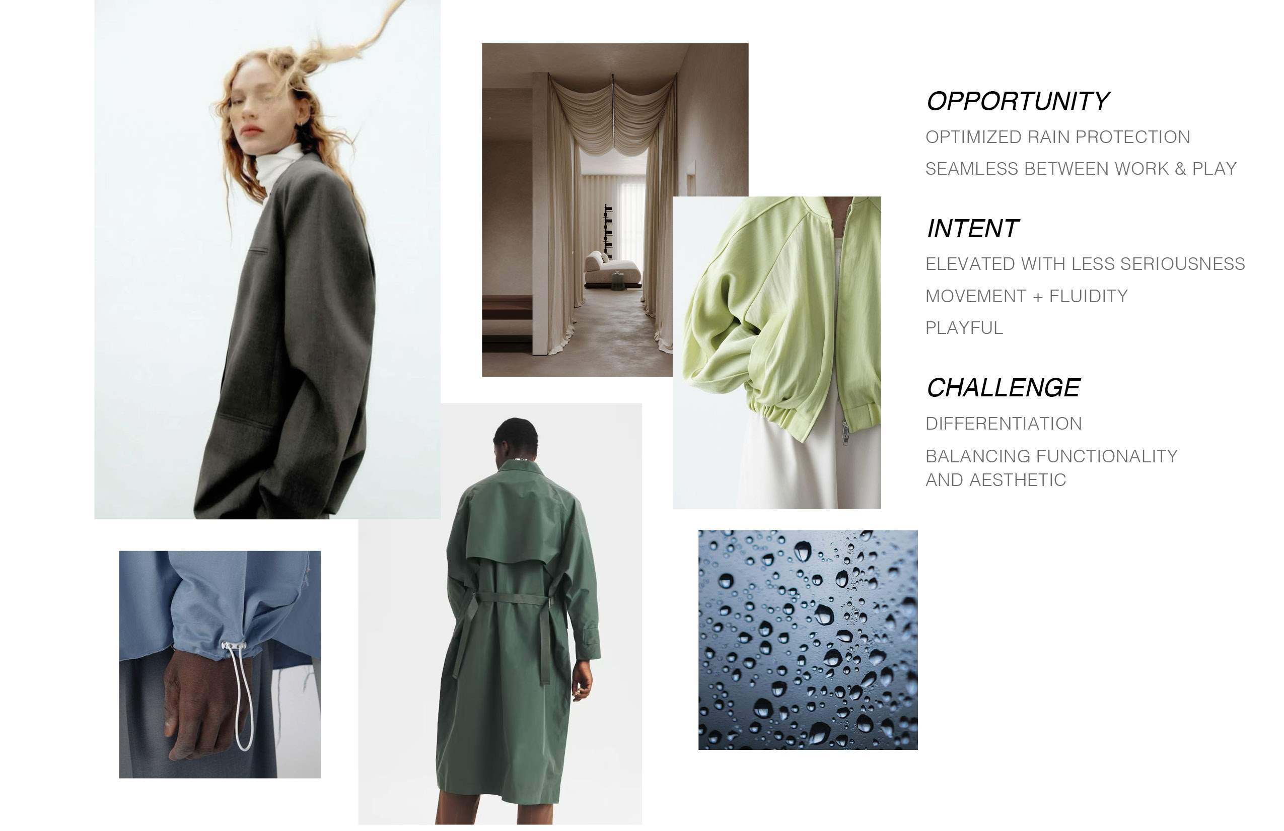 As the introduction of Vessi’s first outerwear pieces, I designed the men’s and women’s Trinity Jackets to transition seamlessly between work and play. With waterproofness as a key element of Vessi’s DNA, the jacket's foundation required excellent coverage and rain protection. To meet the challenge of delivering both an elevated solution that can be worn to work as well as have everyday versatility, I drew from tailored silhouettes and refined elements for a sophisticated aesthetic, complemented by water-inspired elements that indroduce a sense of playfulness. Further functionality was achieved through modular details, allowing stylization and versatility.